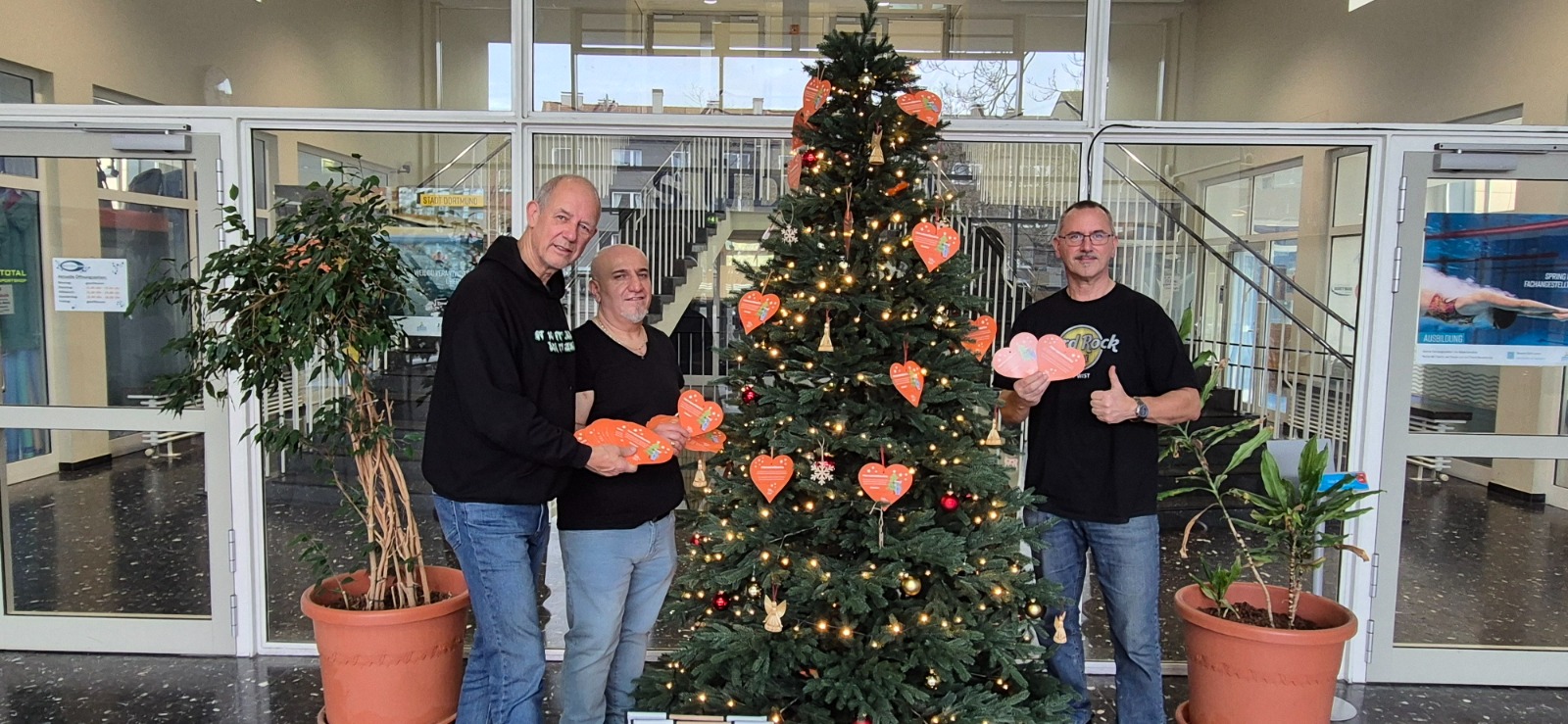 Für jede Spende von 10 Euro wird ein rotes Herz an den Weihnachtsbaum im Foyer des Dortmunder Südbades gehängt.