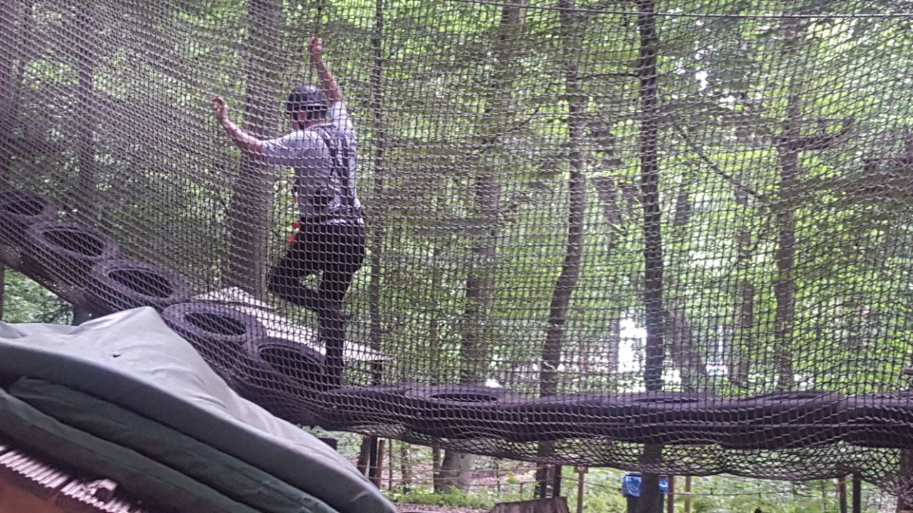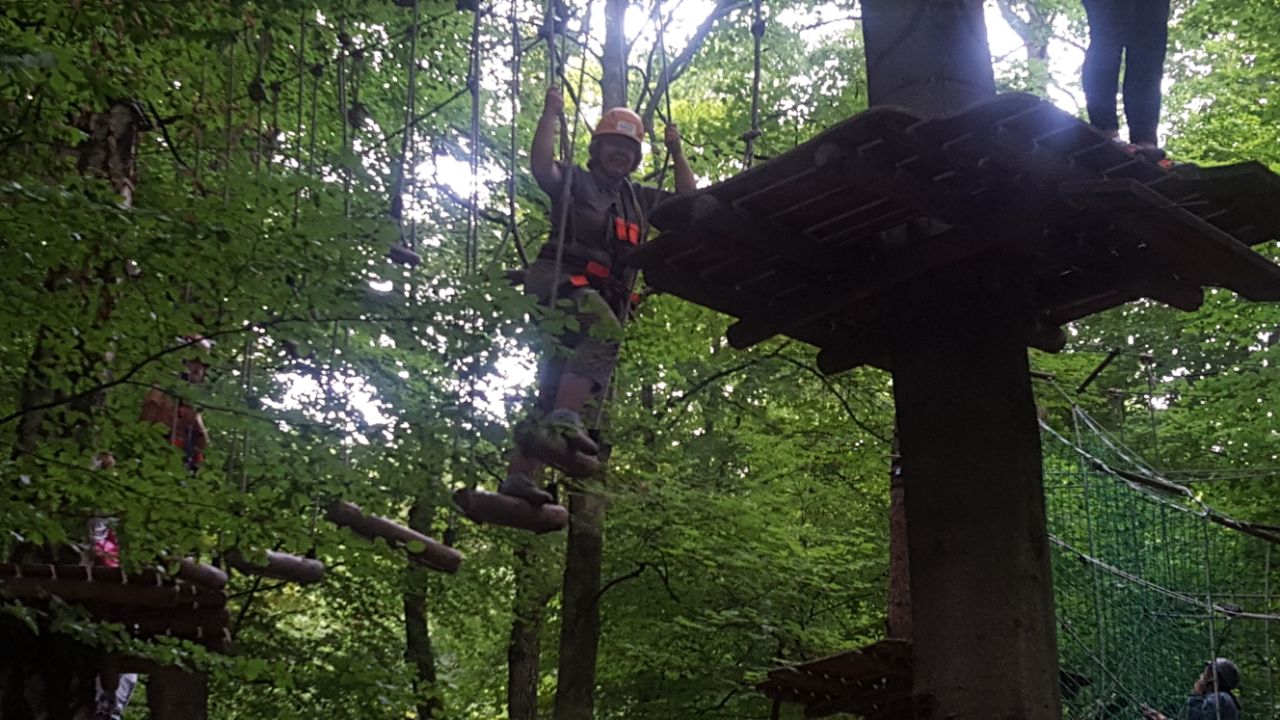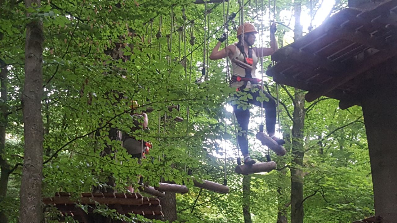 So waren zwei Generationen Schwimmer auf den Parcours vereint und halfen sich gegenseitig die unterschiedlichen Schwierigkeitsgrade zu bewältigen. Ob es nun der Anfängerkurs zu Beginn unserer Klettertour oder der Expertenkurs am Ende war, wir nahmen jede Herausforderung gemeinsam an. Trotz einiger Po-Landungen im Rindenmulch und Kräfteverlust am Ende der dreistündigen Kletterzeit, hatten wir alle sehr viel Spaß. Und die Erkenntnis bleibt: man ist immer so jung wie man sich fühlt – auch wenn der Muskelkater am Tag danach uns eines Besseren belehren wollte.