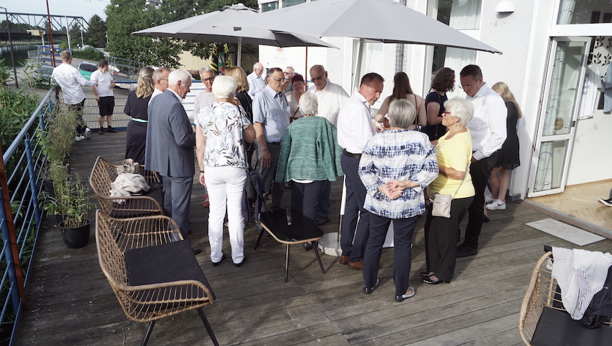 Nach der ausgiebigen Begrüßungsrunde auf der wunderschönen Terrasse mit Blick auf den Kanal fand sich die Gesellschaft im festlich geschmückten Festsaal ein, wo ein reichhaltiges, sehr leckeres Buffet und einige Programmpunkte auf uns warteten.