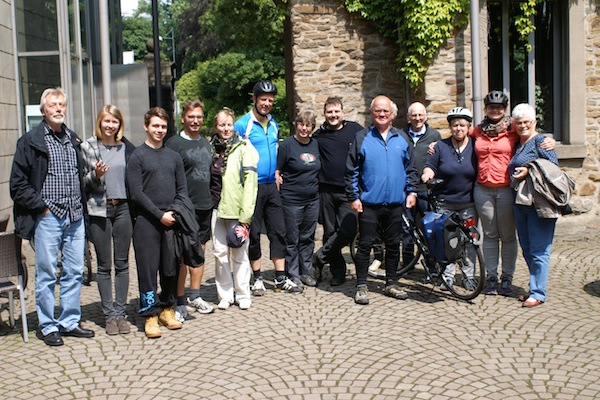 Für die Mittagspause war ein besonderer Ort gewählt worden - Haus Witten. Die Ruine des alten Rittersitzes wurde in den 80ern behutsam mit Stahl und Glas restauriert und bietet neben guter Küche auch einen Blickfang für die Augen. Frisch gestärkt ging es wieder Richtung Heimat, wo uns kurz vor Hombruch noch einmal das Servicefahrzeug mit Getränken und Kuchen erwartete. Manch einer behauptet inzwischen, dass das Radfahren zwischen den kulinarischen Pausen etwas störend ist. Da tauchte eine schwarze unheilvolle Wolkenwand am Himmel auf, die uns überstürzt aufbrechen ließen. Nun wurde kräftig in die Pedale getreten und wir konnten tatsächlich ein Parkplatz am Südbad trocken erreichen, wo wir sogar noch Zeit für ein Zielfoto hatten.