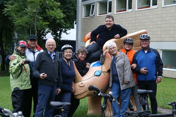 Schwimmer und wasserscheu? Kann nicht sein! Und so machte sich eine kleine aber entschlossene Gruppe vom Dortmunder Südbad aus mit dem Rad auf den Weg, die Schönheit der abwechslungsreichen Landschaft des östlichen Ruhrgebiets auf einer 3-Städte-Tour zu erfahren. Doch noch nicht weit gekommen, wurden die ersten Rufe nach Regensachen lauter. Beim nahegelegenen Supermarkt konnte nicht nur der Regen abgewartet, sondern auch der erste Kaffee getrunken werden bevor es weiter zum ersten Etappenziel im Technologiepark ging. Dort erwartete uns bereits das Servicefahrzeug mit einem kleinen Imbiss und Kaffee. Frisch gestärkt und die Regensachen bereits wieder verstaut ging es weiter Richtung Osten. In Langendreer wurde dann erste Teil des Rheinischen Esels bezwungen. Auf dieser stillgelegten Bahntrasse mit ging es bis nach Witten und nur die Markierung unterwegs hat verraten, dass wir uns zwischenzeitlich in Bochum befunden haben.